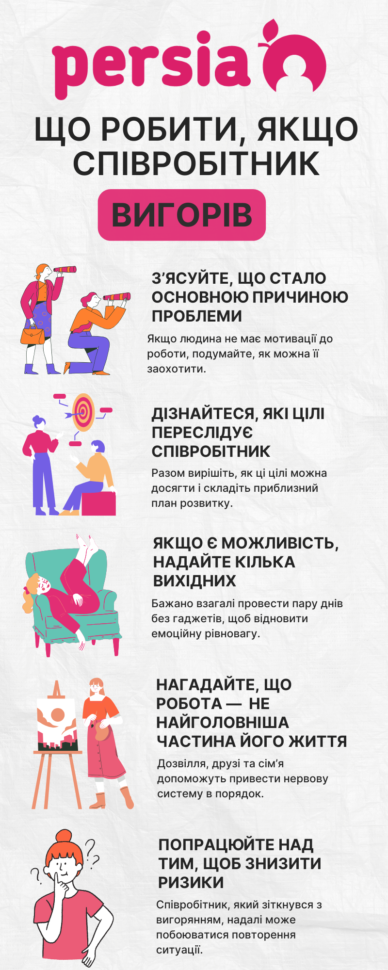 Ми зібрали інфографіку про те, як можна запобігти такій проблемі, і про те, що робити, якщо співробітник вигорів. Докладніше можна прочитати у нашій статті.
